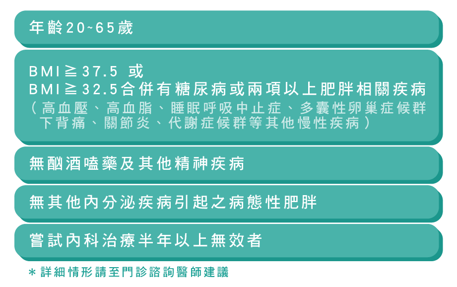 依健保規定,病態性肥胖症病人接受減重手術適應症,如圖。
